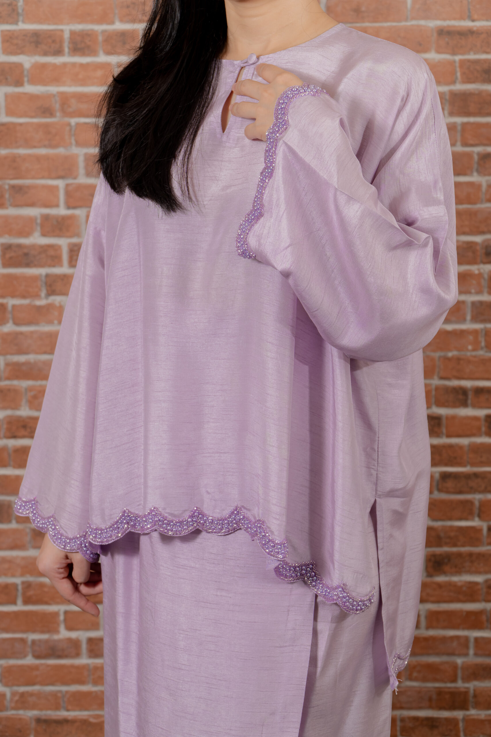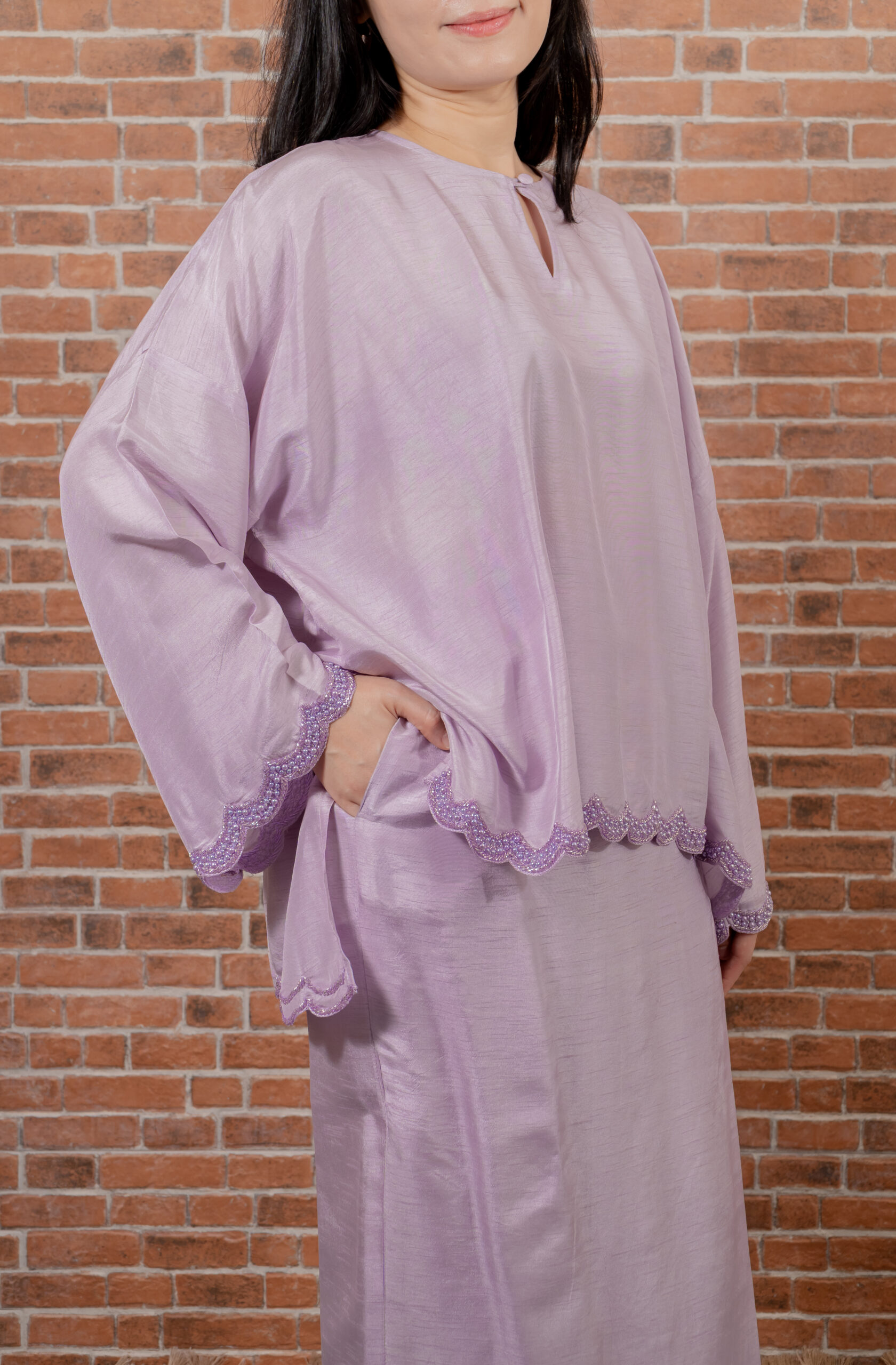 Meet your new favorite lilac daydream. This two-piece set is all about easy elegance with a playful twist. The Kurung Kedah features beaded, dainty hand embroidered scalloped trims along the sleeves and hem—because subtle details deserve their moment too. Paired with matching sarung, it creates a look that’s relaxed, refined, and effortlessly put-together.