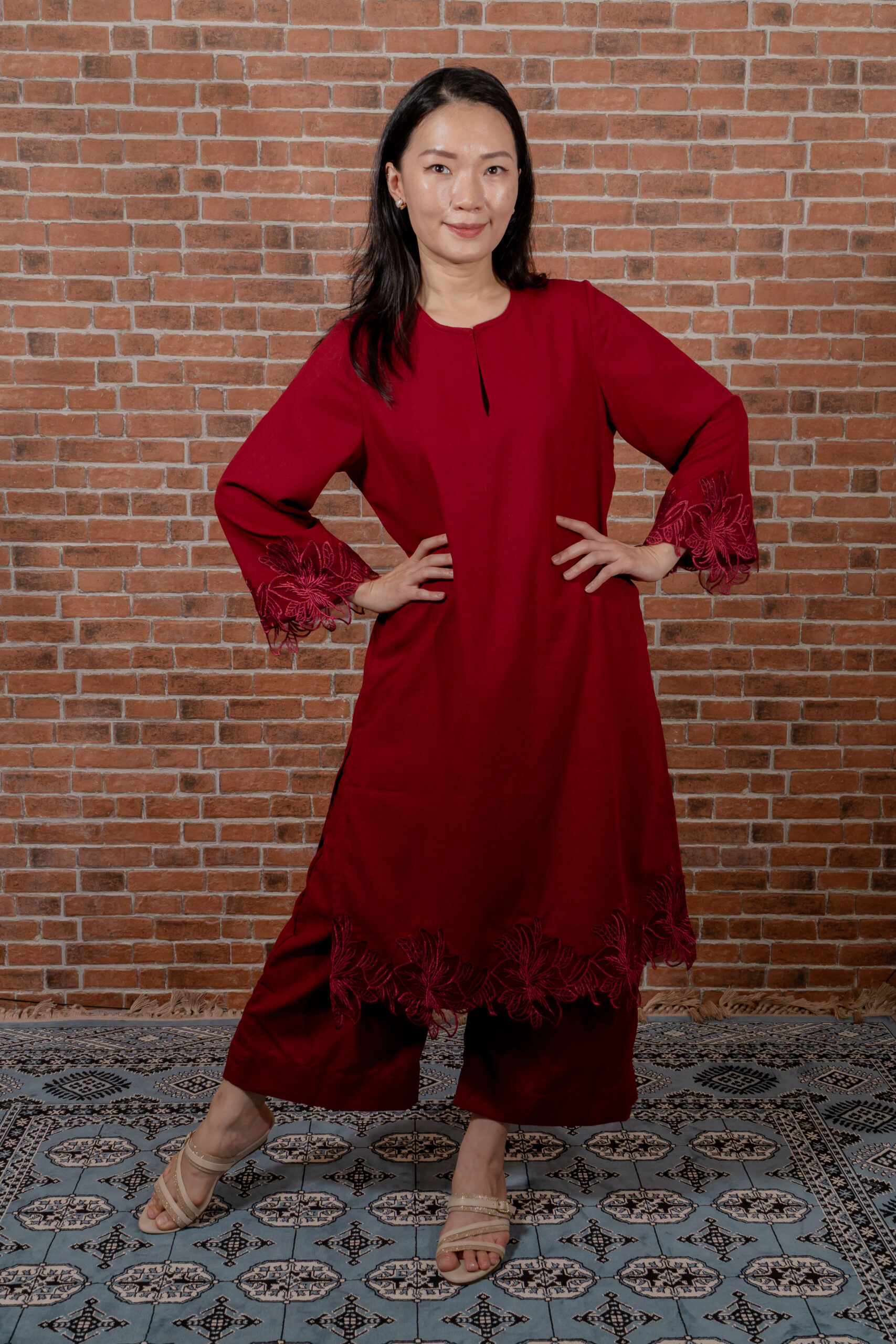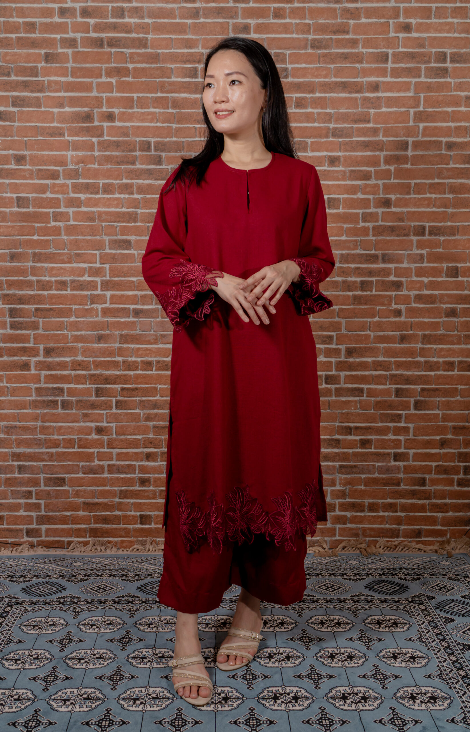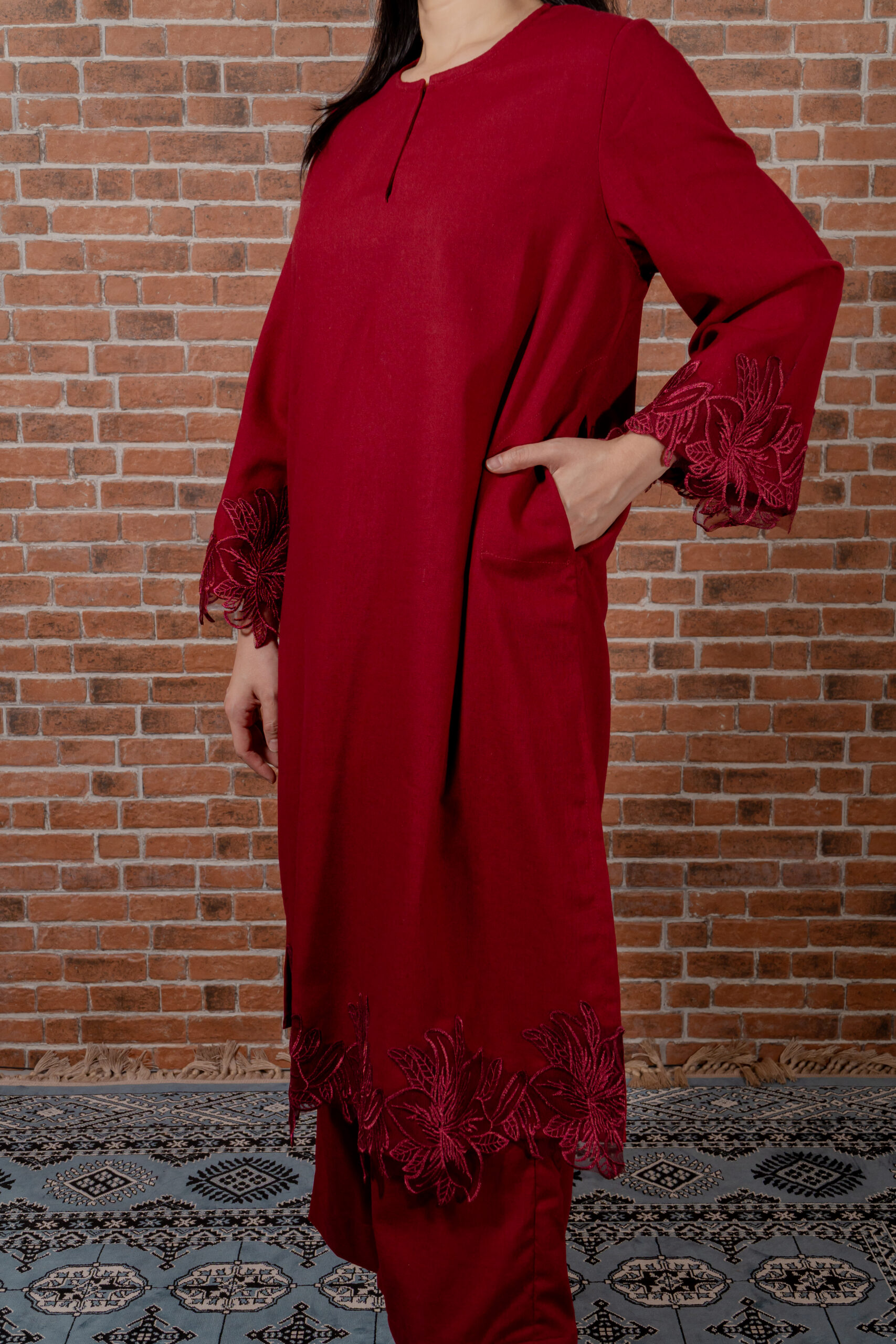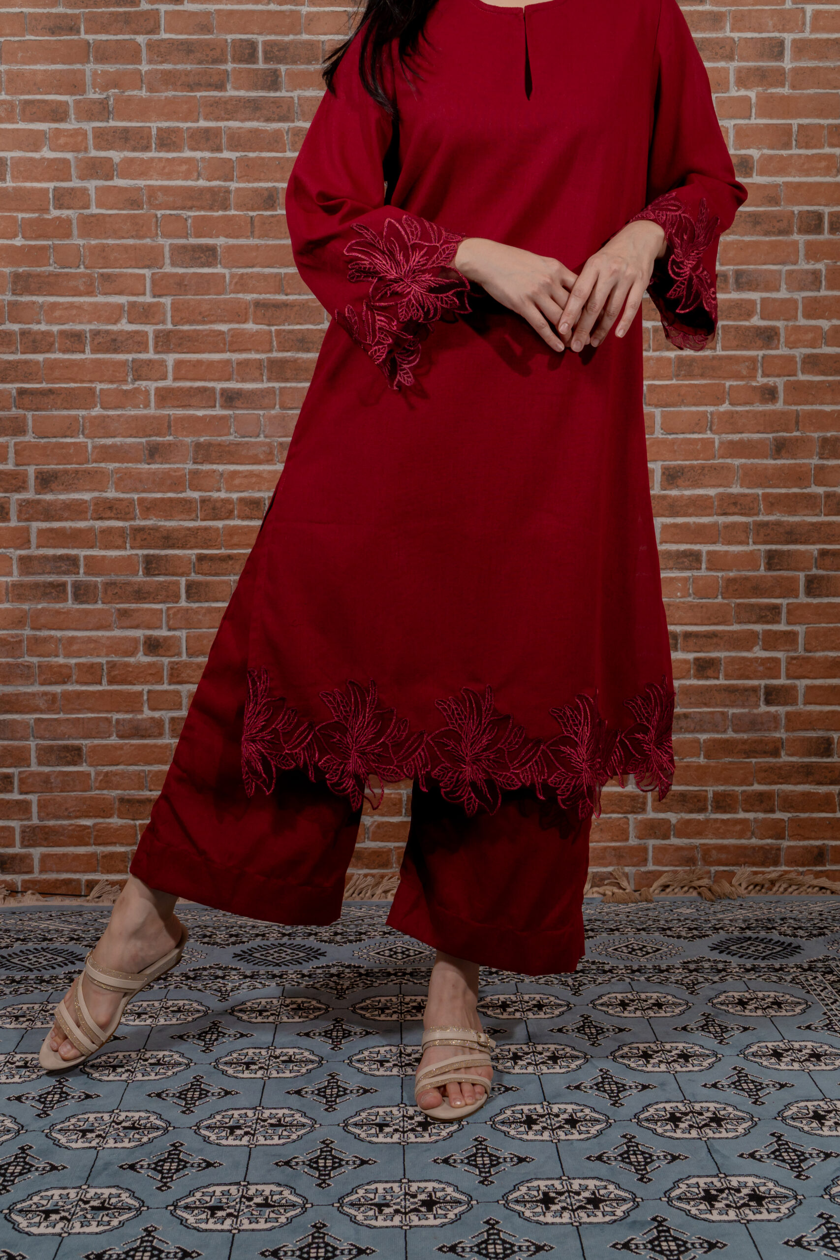 A deep maroon reminiscent of rubies; a perfect splash of colour to your collection. A fresh take on the classic two piece kurta and culottes with a dash of floral femininity thrown into the mix.