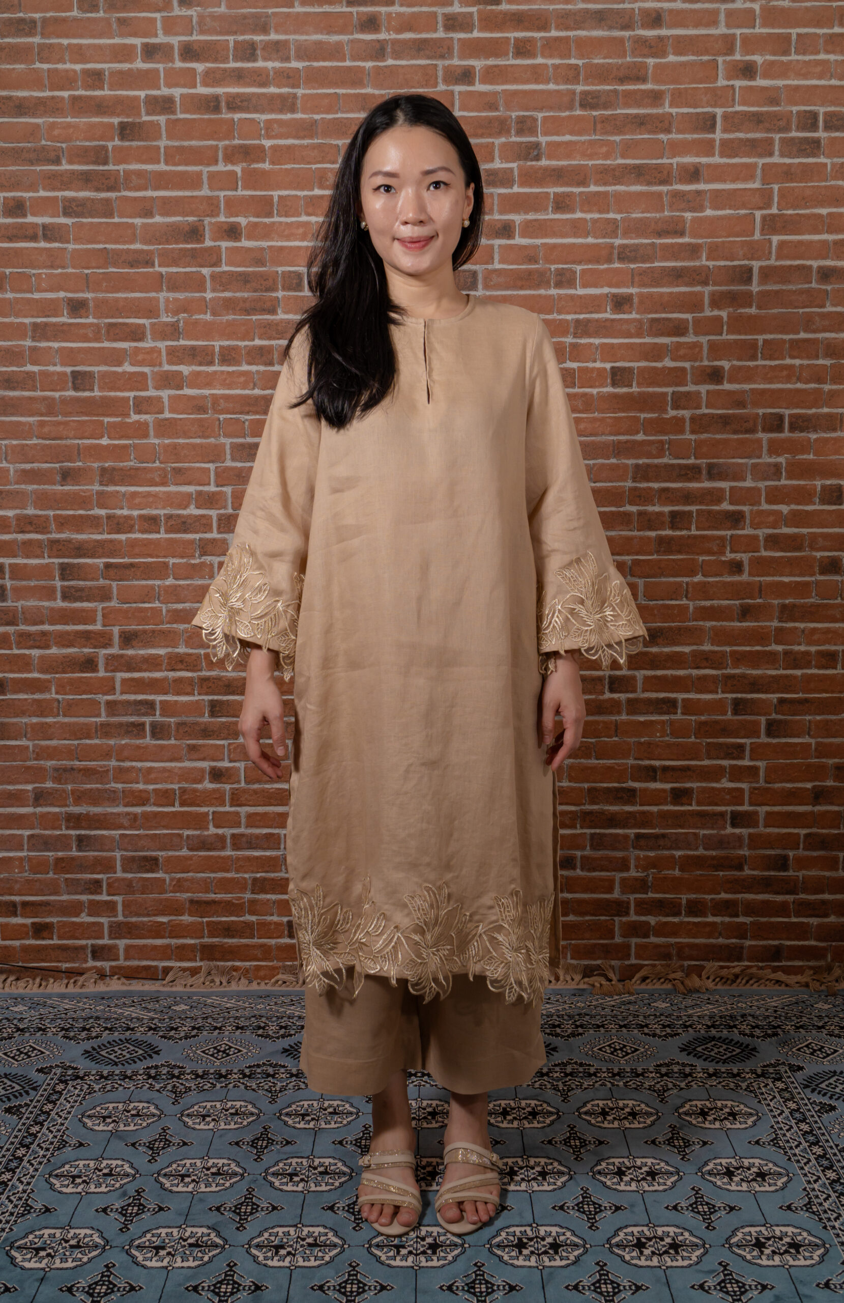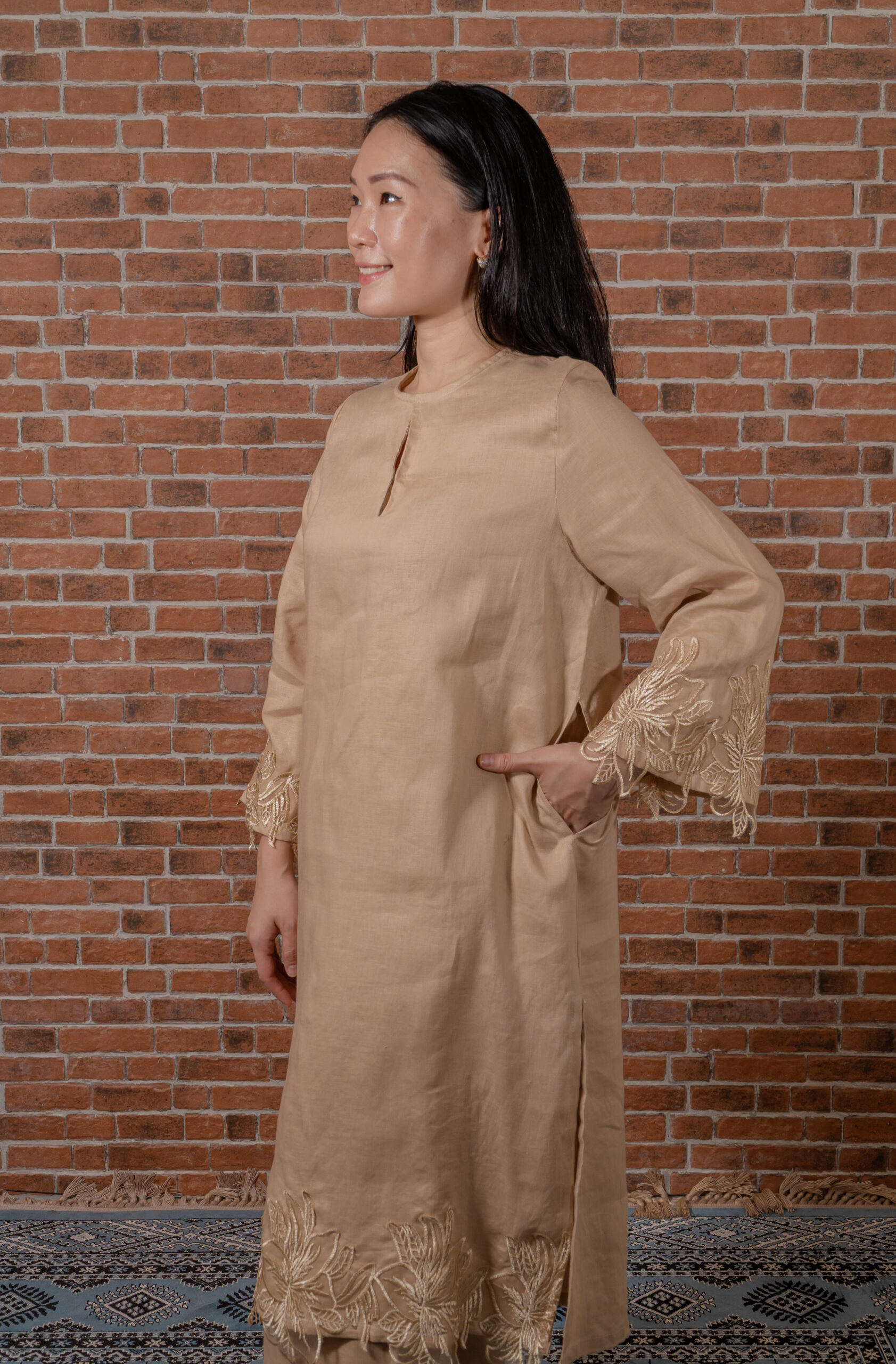 Made with high quality cotton linen material, the loose fitting kurta set comes with delicate floral lace detailing at the hems. This set is made with light weight cotton linen that is perfect for tropical weather.