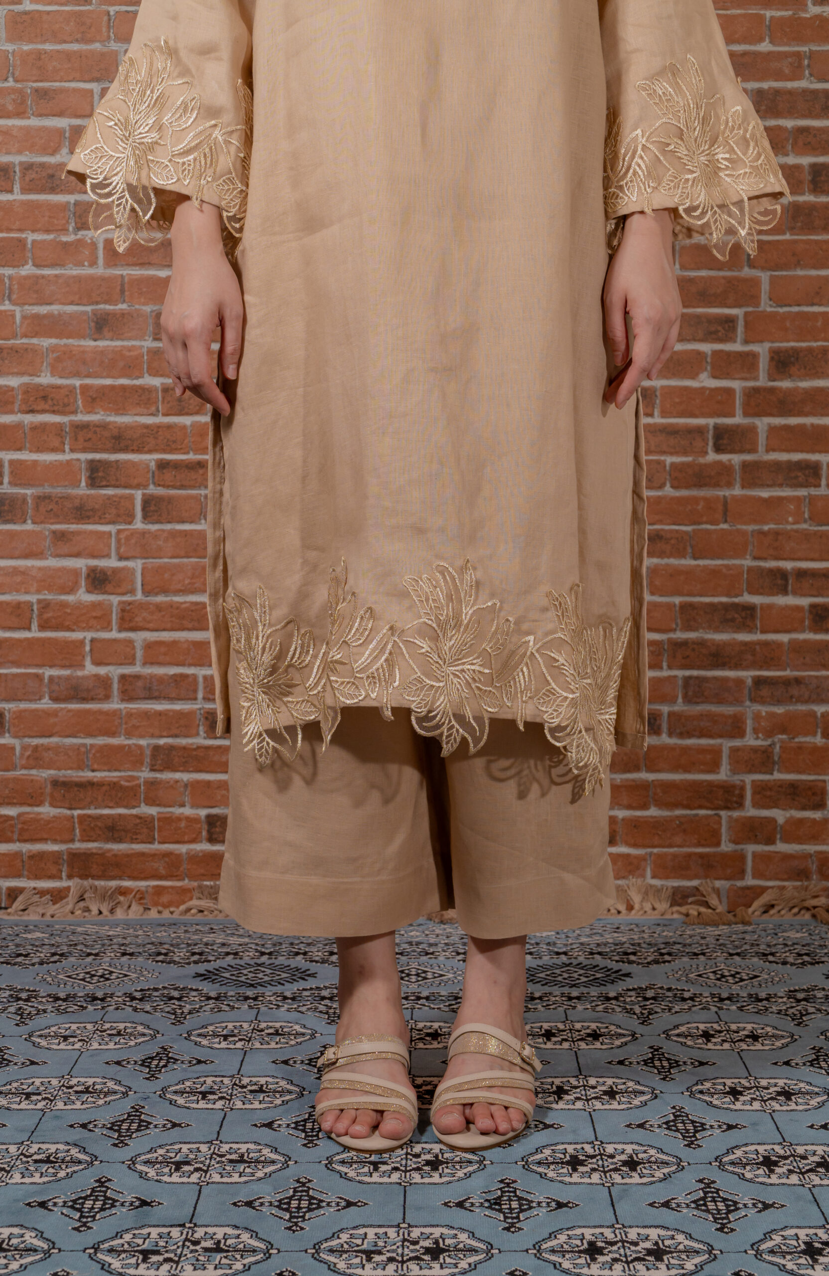 This warm beige two-piece set proves that understated can still steal the show. The relaxed kurta flows effortlessly, but the real star? Those gorgeous lace details dancing along the sleeves and hem—delicate, floral, and just a little bit flirty. It’s like your outfit decided to smile back at you.